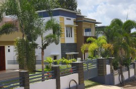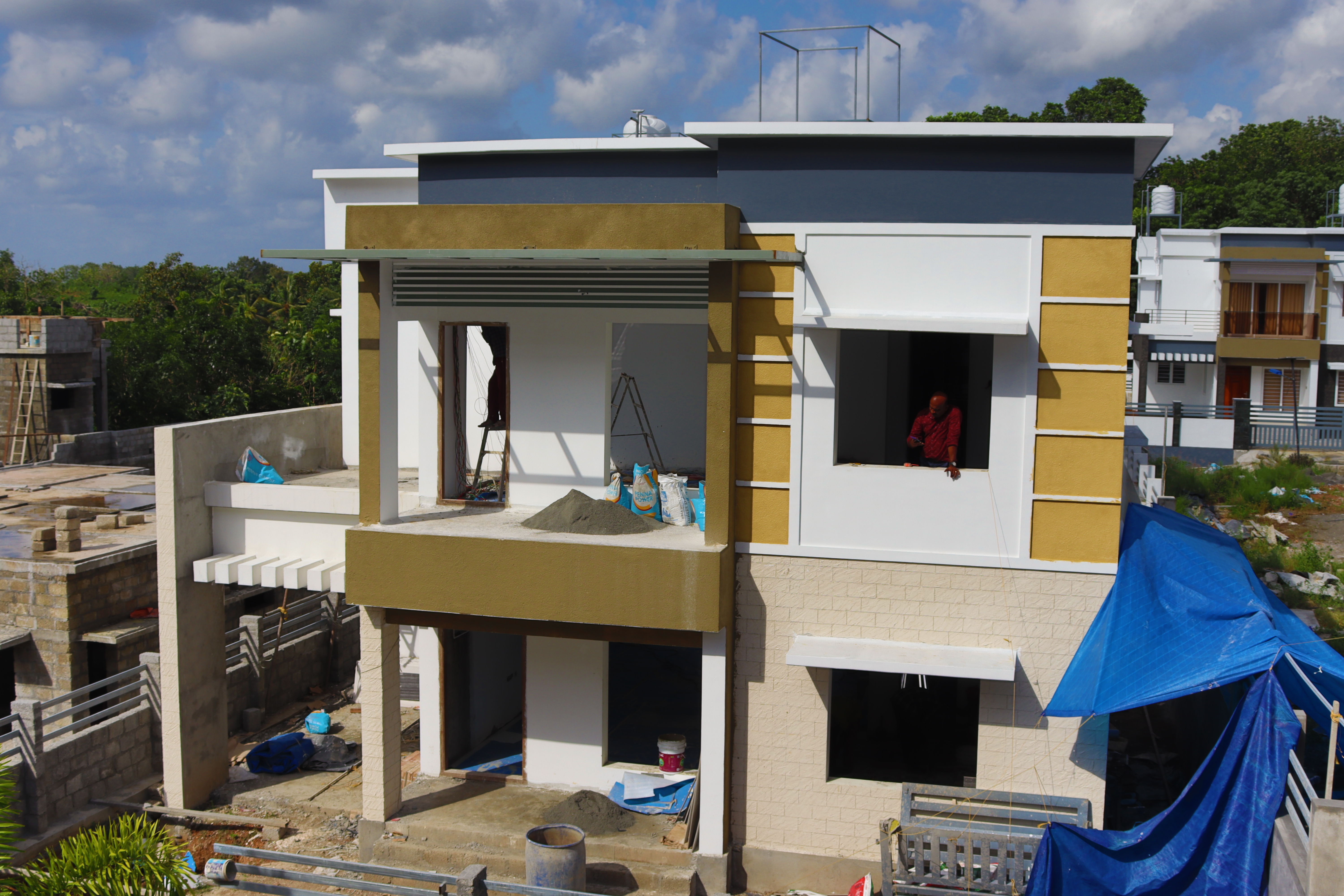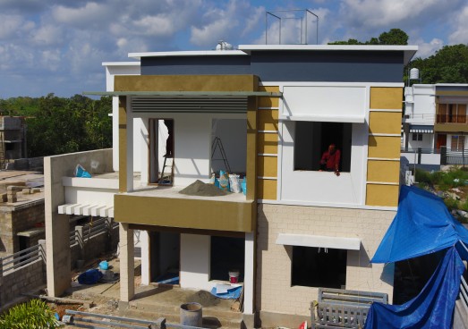 Emulsion paint with putty finish for inside walls and ceiling. Exterior Emulsion for external walls, enamel paint for woodwork and grill.